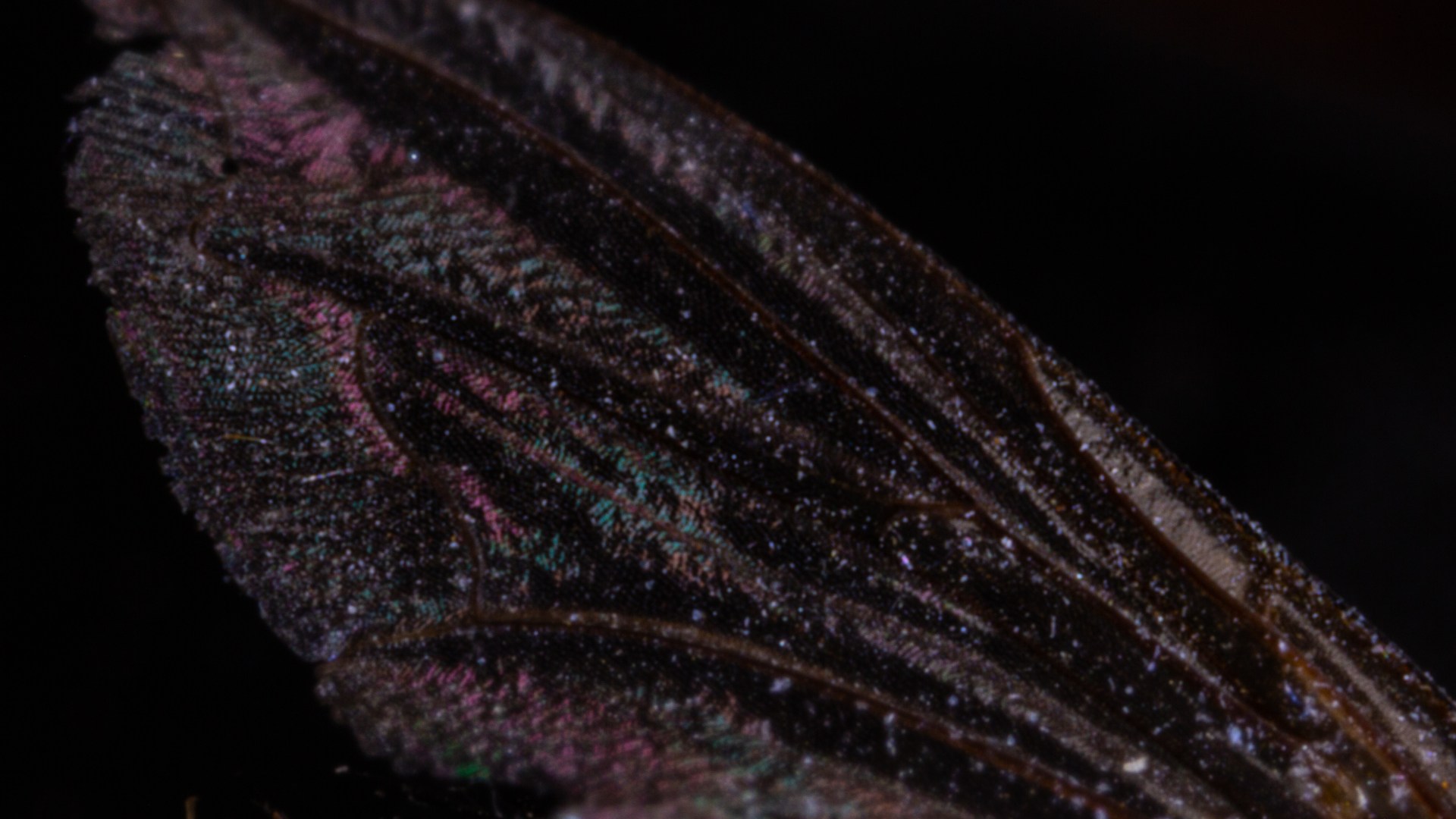 Day 189 of the 365 to 40 project. I found a very dead and very dessicated house fly today and my original plan was to take a photo of its head. Unfortunately as I was moving it into position the head, well it fell off. And I can’t find it. So I had to settle for trying to take one of the fairly dust covered wing. Never could get the angle right on it but did manage to capture some of the iridescence.
